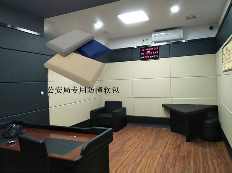 防撞軟包采用高密度環(huán)保防火吸音棉,飾面皮革或者布藝,防撞系數(shù)高,且不易斷裂,是公安局辦案區(qū)審訊室、紀(jì)檢委談話室等執(zhí)法部門墻面防撞阻燃吸音裝飾材料、防止嫌疑人出現(xiàn)自殘行為的專用安全產(chǎn)品。