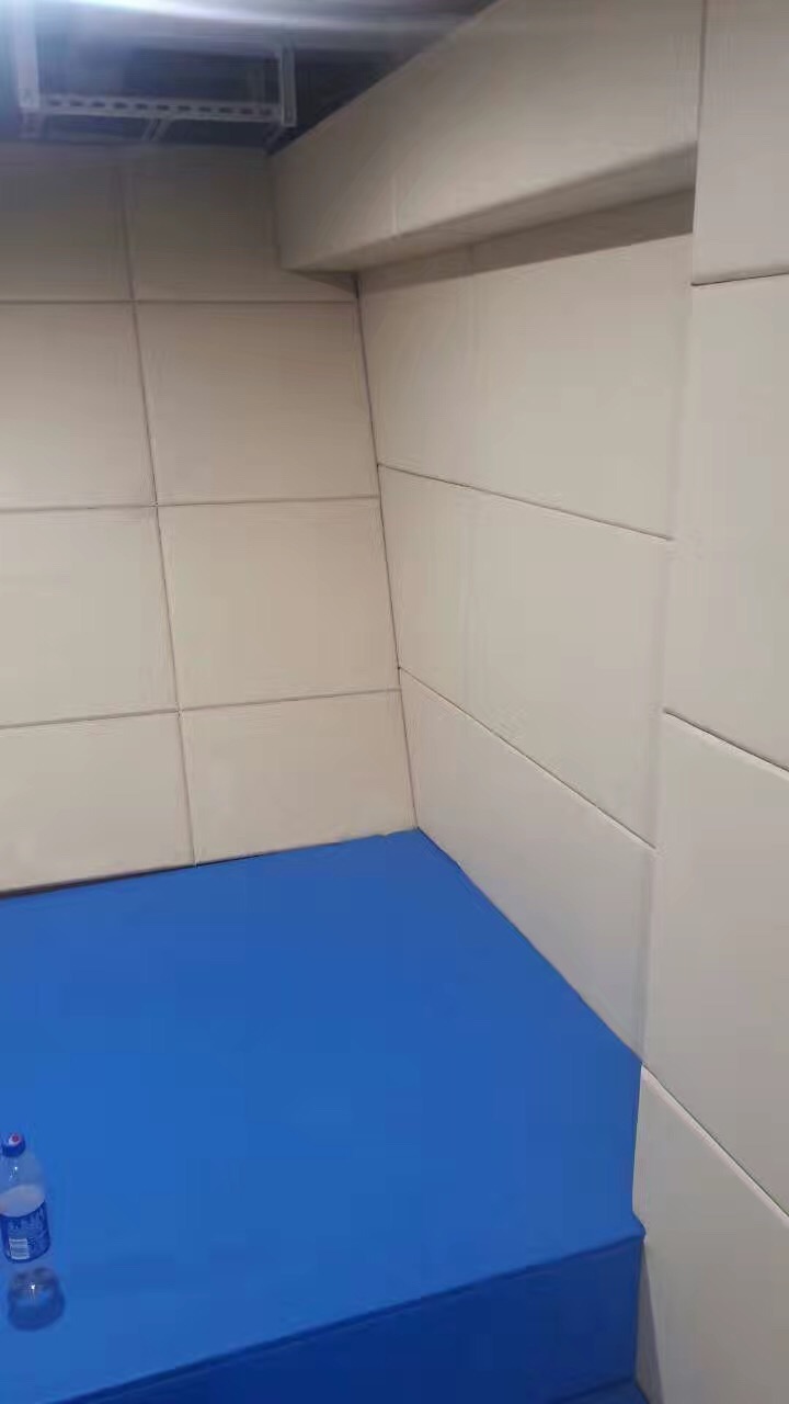 3.施工后,查看軟包墻板邊緣是否有縫隙,如縫隙較大可補(bǔ)膠處理,留置室四周陰陽角施工在軟包背面基材開直角槽,小木條加F30射釘固定墻板,待拆下無脫落現(xiàn)象即可用硅膠中線條封邊。