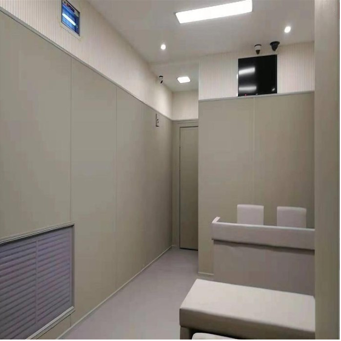 2、為防止被談話人以頭撞墻產(chǎn)生意外,墻面應用厚度大于17MM阻燃JLL-RB02防撞軟包材料進行包裝,不允許意外事件的發(fā)生??紤]到可能采取留置措施,室內(nèi)還需要配備隱蔽式全軟包側翻床。