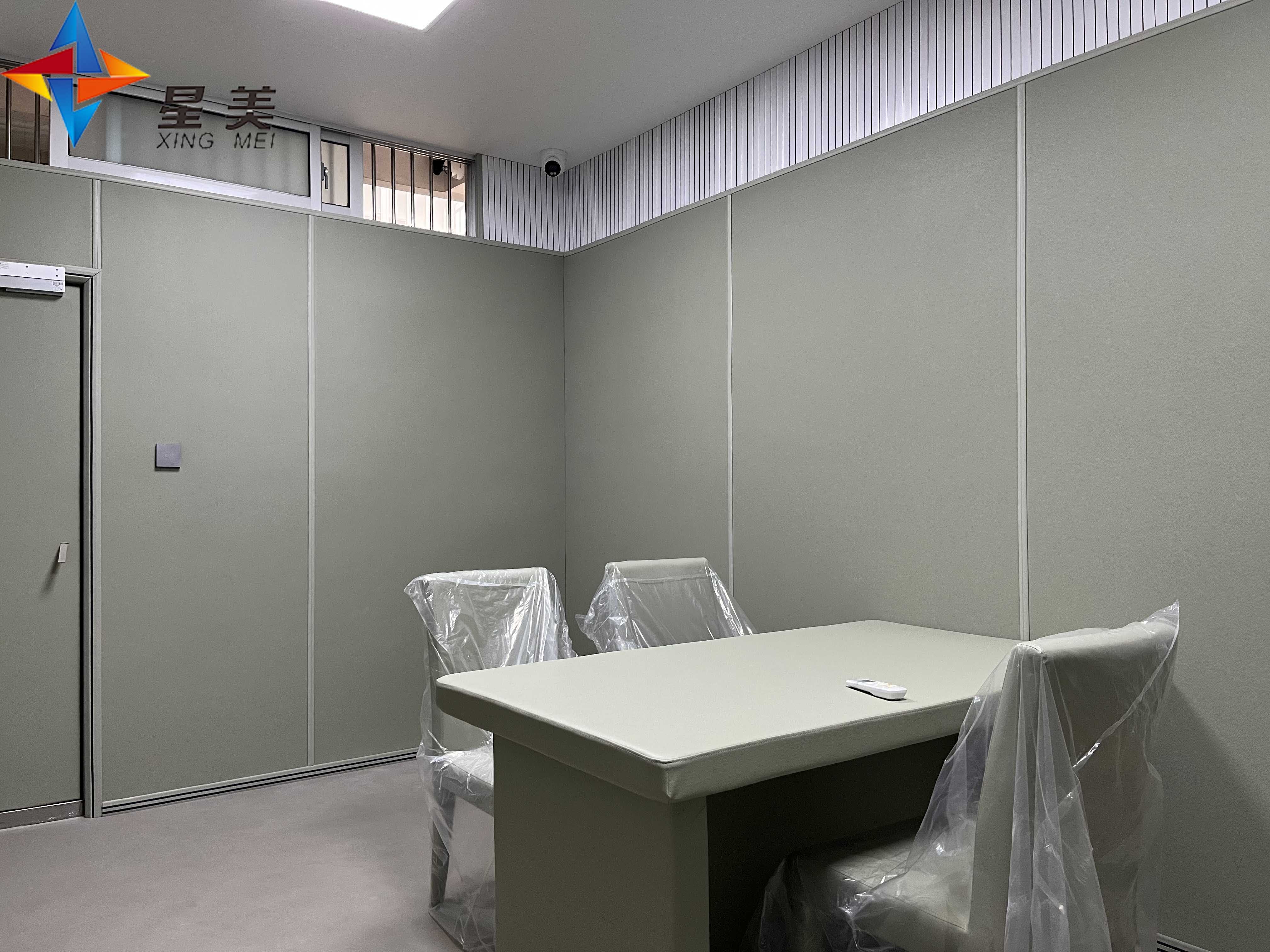 談話室內(nèi)所能觸及的尖銳物體,硬化物體都需要做防撞防護(hù)。為防止在辦案過(guò)程中,犯人有過(guò)激的行為,選擇自殘或者傷害執(zhí)法人員的情況。需要有三種特性,防火、防撞、吸音(這三個(gè)特性顯得尤為重要,符合國(guó)家單位場(chǎng)所的材料標(biāo)準(zhǔn)要求(消防、環(huán)保、防火、吸音)。